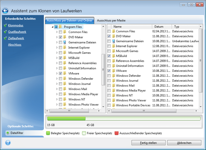 Falls Sie bestimmte Dateien eines Quelllaufwerks nicht mitklonen wollen (beispielsweise, weil Ihr Ziellaufwerk kleiner als das Quelllaufwerk ist), können Sie diese auf Wunsch im Schritt Ausschlusskriterien ausschließen.