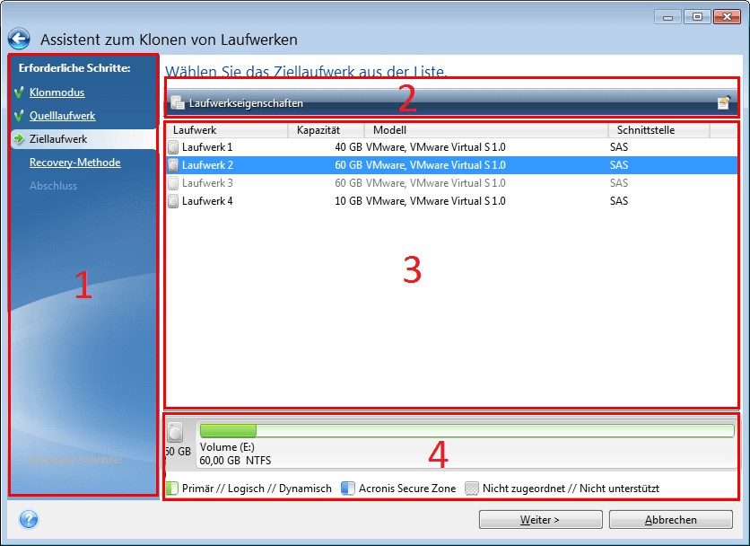 - Dies ist die Liste der Schritte, um die Aktion abzuschließen. Neben einem abgeschlossenen Schritt erscheint ein grünes Häkchen. Ein grüner Pfeil kennzeichnet den aktuellen Schritt. Nach Fertigstellung aller Schritte zeigt das Programm im Schritt Abschluss eine Zusammenfassung an. Überprüfen Sie die Zusammenfassung und klicken Sie dann auf Fertigstellen, um die entsprechende Aktion zu starten.