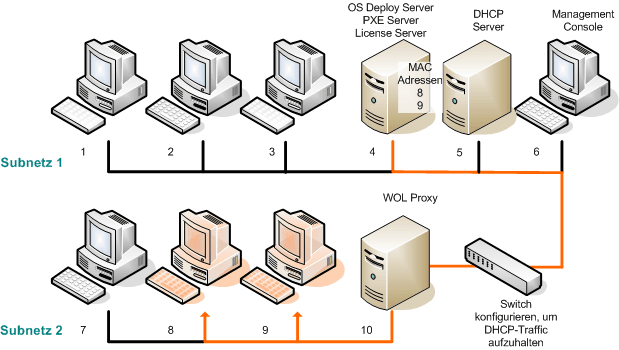 Deployment in ein anderes Subnetz mithilfe des Acronis Wake-on-LAN Proxy. Der Netzwerkswitch ist so konfiguriert, dass er den PXE-und DHCP-Netzwerkverkehr weiterreichen kann.