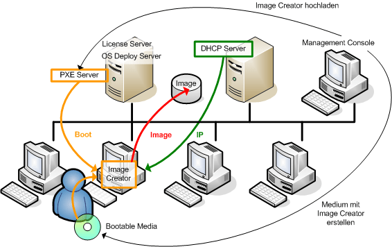 - Booten Sie die Maschine mit dem Master Image Creator – je nach Auswahl im vorangegangenen Schritt entweder von einem Boot-Medium oder vom PXE Server.