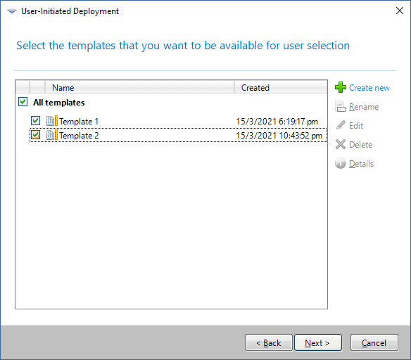 Erstellen Sie die Deployment-Templates entsprechend den Anforderungen in Ihrem Unternehmen. Vergeben Sie für jedes Template einen für die Benutzer leicht verständlichen Namen. Wählen Sie eine oder mehrere Templates, um sie dem Boot-Menü hinzuzufügen.