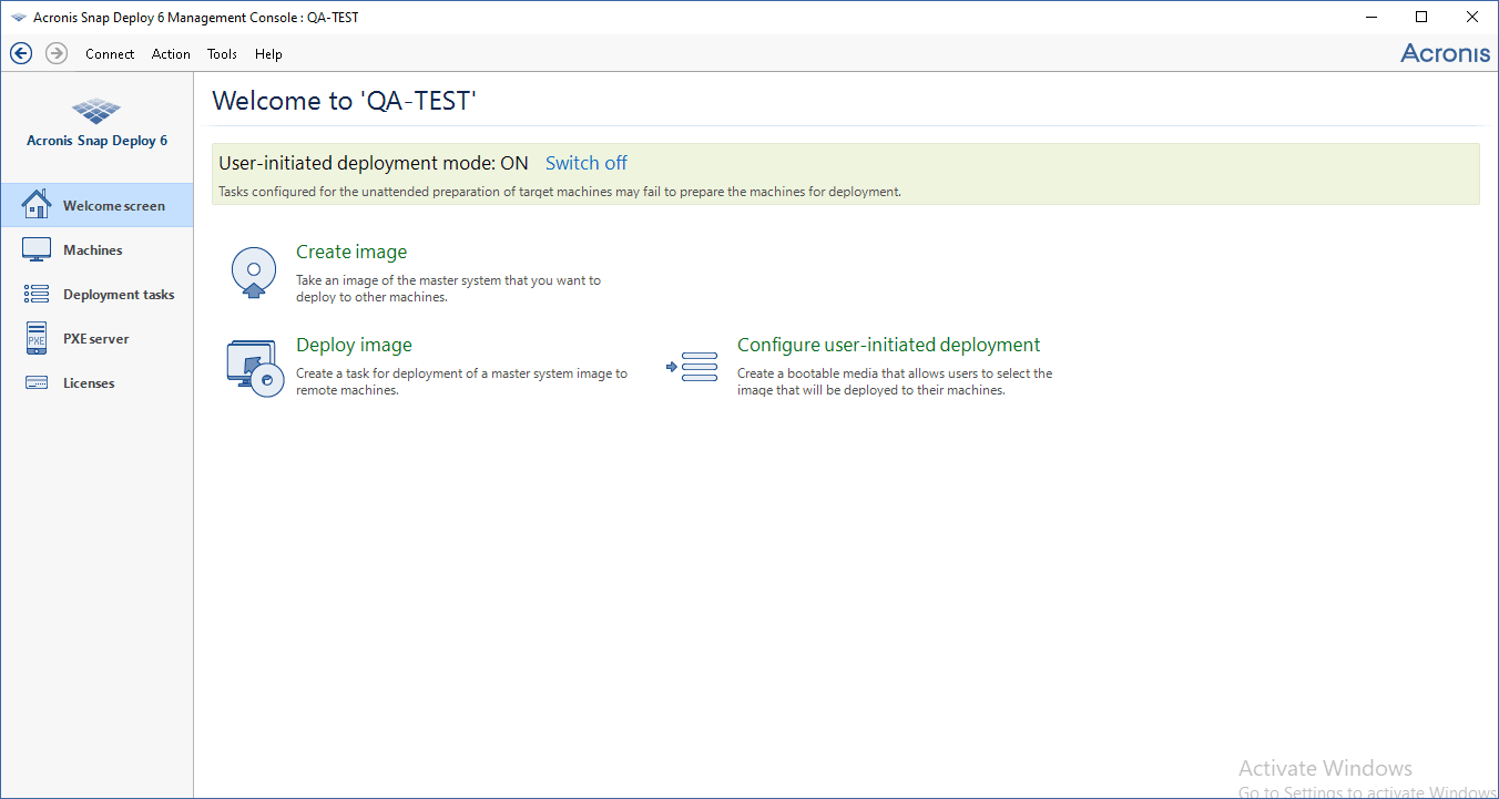 Klicken Sie in der Willkommensseite auf Benutzerinitiiertes Deployment konfigurieren. Spezifizieren Sie bei Aufforderung die Maschine, auf der der OS Deploy Server installiert ist.