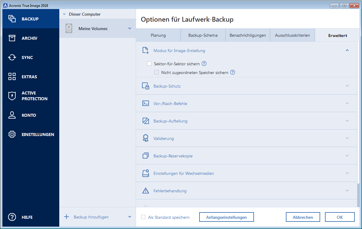 Alle Optionen werden nach Installation des Programms auf Ihre Anfangswerte eingestellt. Sie können diese für eine aktuelle Backup-Aktion oder für alle zukünftig erstellten Backups ändern. Aktivieren Sie das Kontrollkästchen Einstellungen als Standard speichern, um geänderte Einstellungen für alle zukünftigen Backup-Aktionen als Vorgabe zu übernehmen.