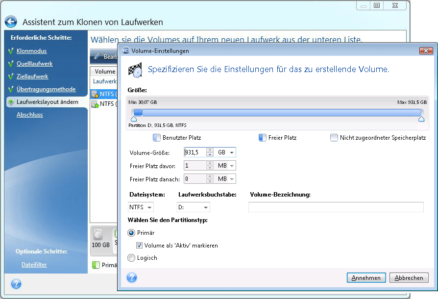 Die manuelle Übertragungsmethode ermöglicht Ihnen, die Volumes (Partitionen) des neuen Laufwerks in der Größe anzupassen. Standardmäßig ändert das Programm die Größen proportional.
