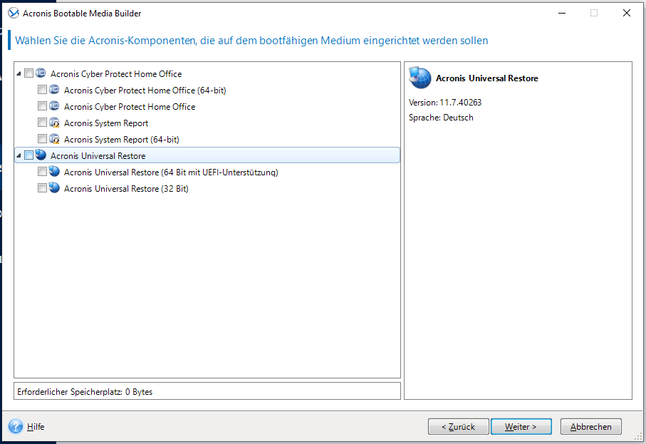 Wählen Sie die Acronis Komponenten, die auf dem Medium eingerichtet werden sollen.