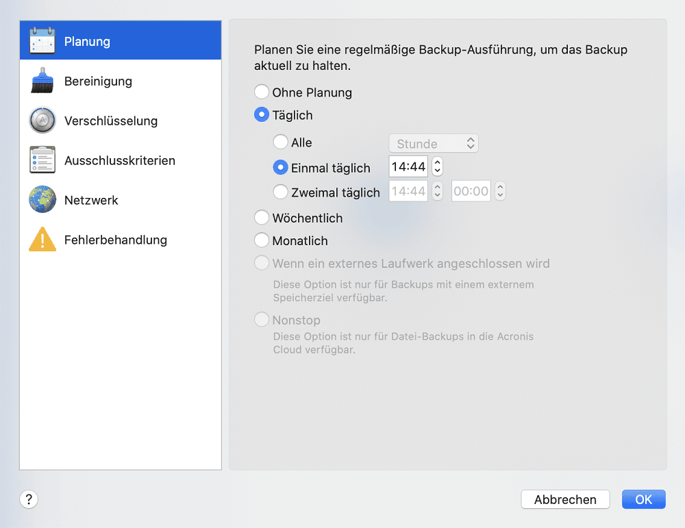 Das Backup startet ein- oder zweimal täglich zur spezifizierten Zeit oder mit einem von Ihnen festgelegten Zeitintervall.