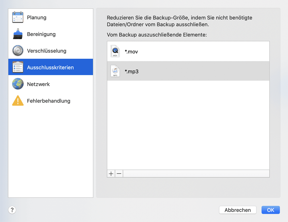 Sie können die Größe eines Backups schon vor dessen Start reduzieren, indem Sie solche Daten ausschließen, die nicht mitgesichert werden müssen.