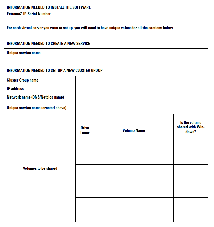 Zur Vereinfachung dieses Prozesses stellen wir Ihnen ein Arbeitsblatt zur Vorbereitung der Installation zur Verfügung. Duplizieren Sie das Arbeitsblatt für jeden weiteren Access Connect Virtual Server, den Sie erstellen möchten. Informationen, die für die Installation der Seriennummer der Software Access Connect benötigt werden: