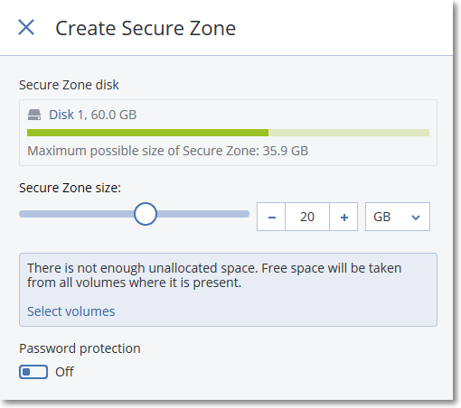 Daraus ergibt es sich, dass es normalerweise nicht ratsam ist, der Einer Secure Zone die maximal mögliche Größe zuzuweisen. Am Ende haben Sie sonst auf keinem Volume mehr ausreichend freien Speicherplatz, was dazu führen kann, dass Betriebssystem und Applikationen nicht mehr starten oder fehlerhaft arbeiten.