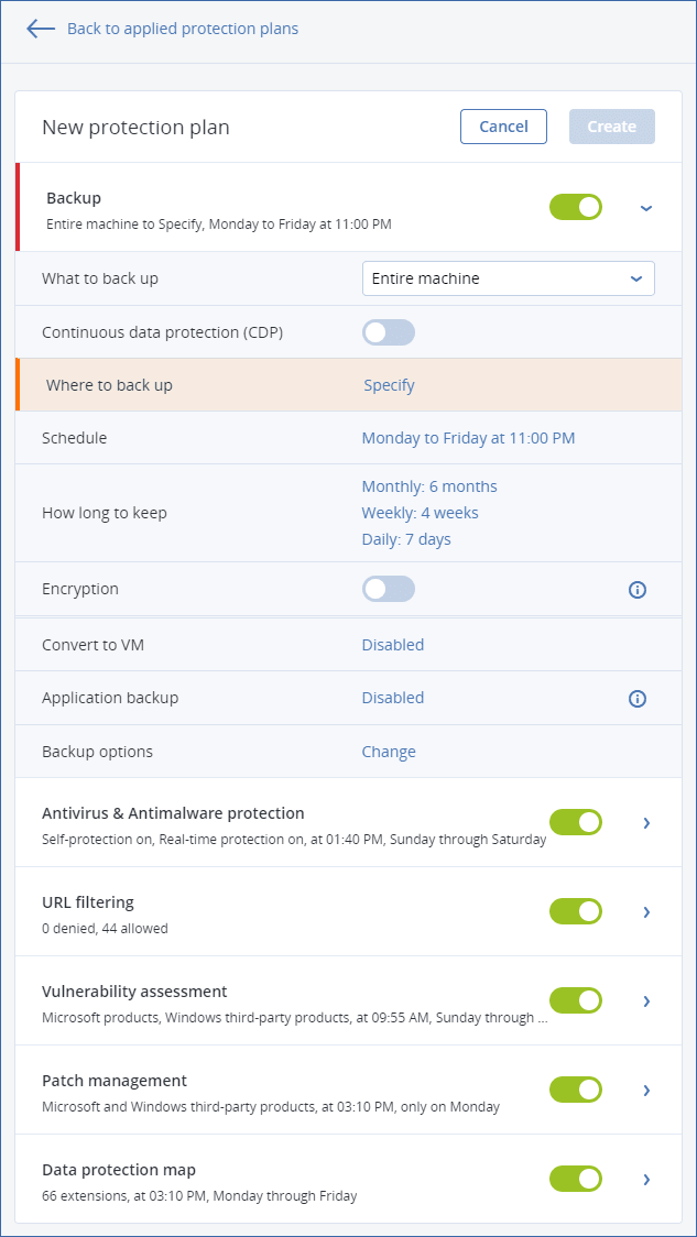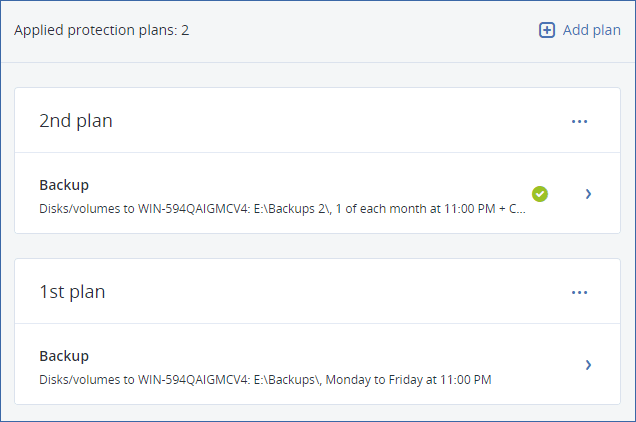 Die Software zeigt die Schutzpläne an, die auf die Maschine angewendet werden. Wenn der Maschine noch keine Pläne zugewiesen wurden, wird Ihnen der Standard-Schutzplan angezeigt, der angewendet werden kann. Sie können die Einstellungen nach Bedarf anpassen und den Plan dann anwenden – oder auch einen neuen erstellen.
