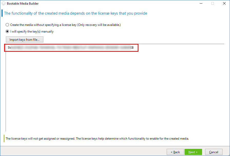 Wenn Sie keinen Lizenzschlüssel spezifizieren, kann das resultierende Boot-Medium nur für Wiederherstellungsaktionen verwendet werden.