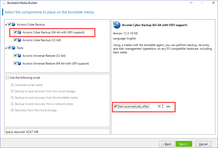 8. [Optional] Wenn Sie die Aktionen des bootfähigen Agenten automatisieren wollen, aktivieren Sie das Kontrollkästchen Folgendes Skript verwenden. Wählen Sie dann eines der Skripte aus und spezifizieren Sie die Parameter für das Skript.