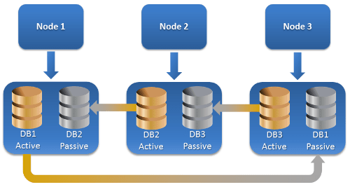 Eine DAG besteht aus einer Gruppe von bis zu 16 Exchange-Postfachservern. Jeder Knoten kann eine Kopie der Postfachdatenbank von jedem anderen Knoten hosten. Jeder Knoten kann passive und aktive Datenbankkopien hosten. Es können bis zu 16 Kopien von jeder Datenbank erstellt werden.