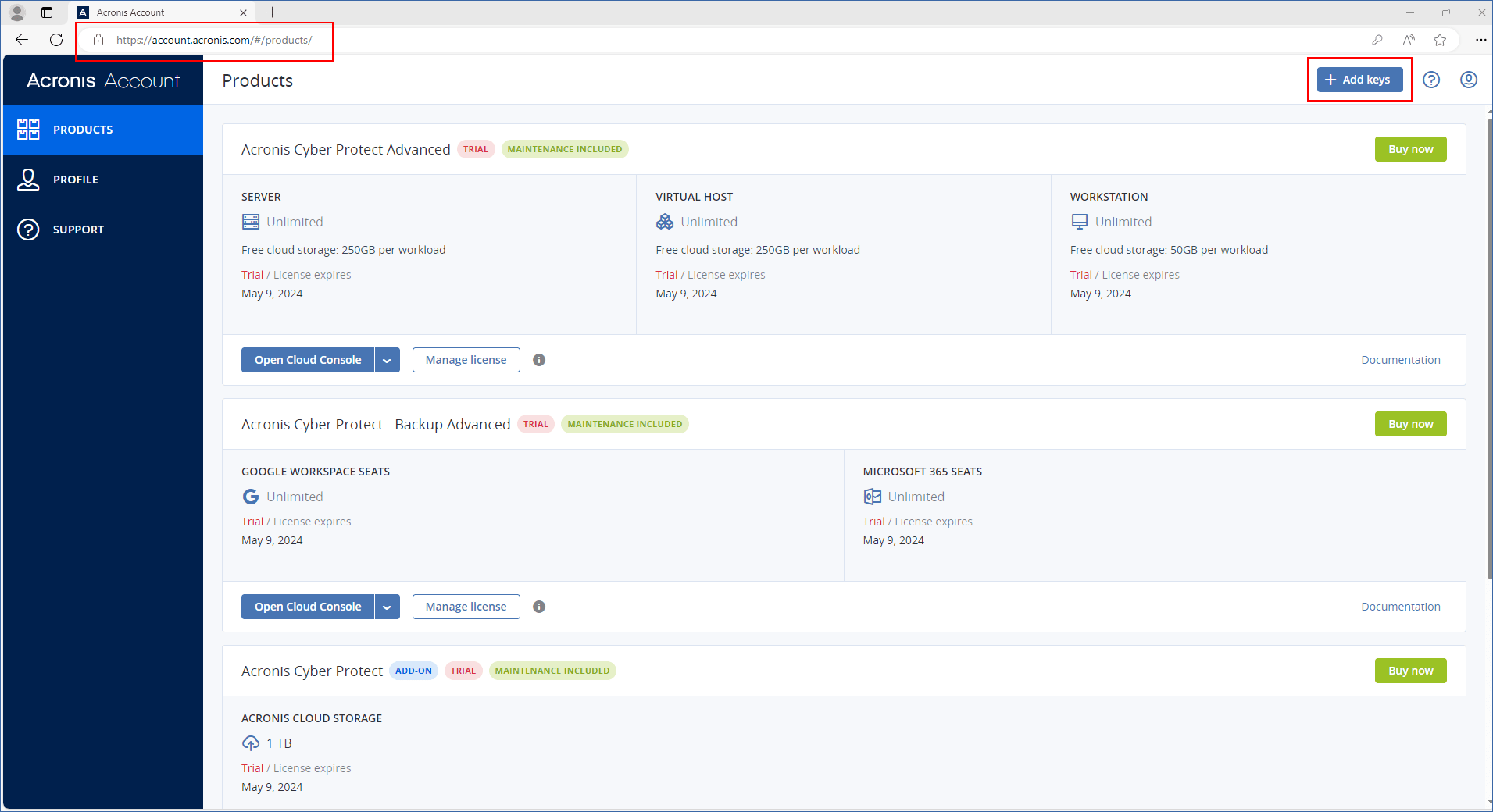 Für neue Kunden ist das Acronis Kunden- und Support-Portal ein direkter Bestandteil der Cloud-Konsole. Diese Kunden werden zur Cloud-Konsole weitergeleitet, wenn sie sich bei ihrem Konto unter https://account.acronis.com anmelden.