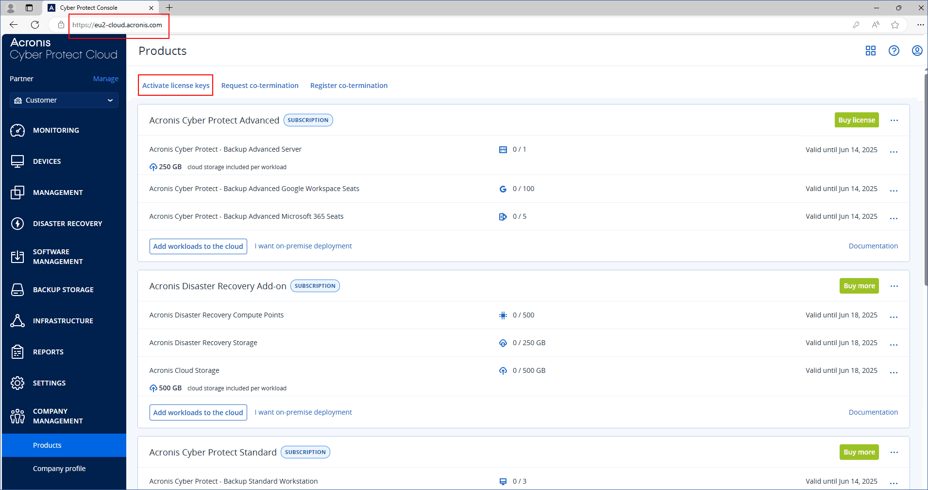 Die Lizenzen werden nun zu Ihrem Konto hinzugefügt und Sie können deren Verwendung in der Cloud-Konsole (https://cloud.acronis.com) auf der Registerkarte Einstellungen > Lizenznutzung verwalten.