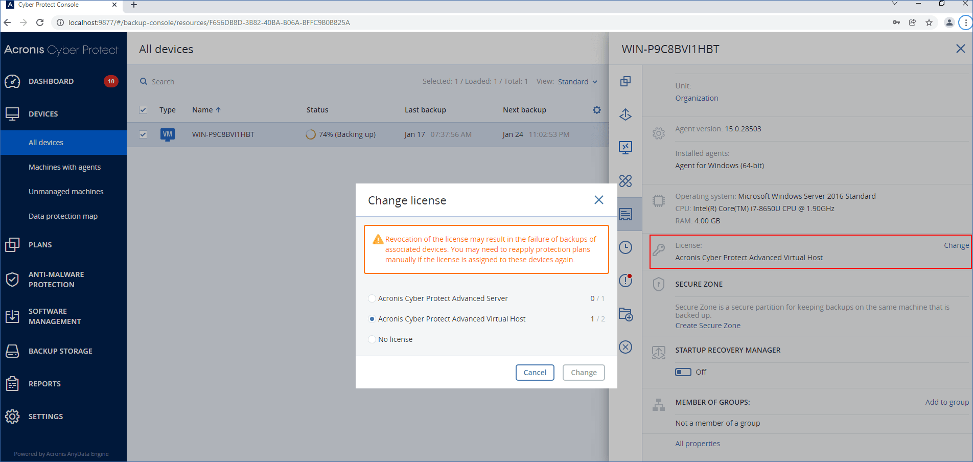 - [Für lokale Management Server] Gehen Sie zum Bereich Lizenz und klicken Sie dort auf den Befehl Ändern.