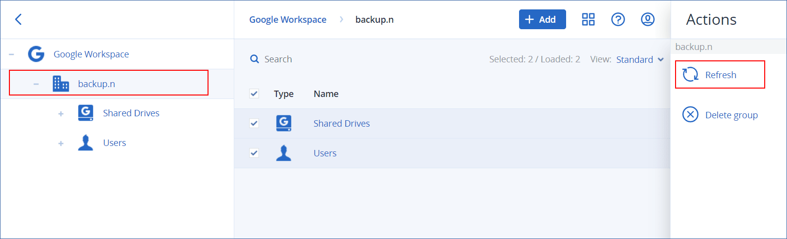 - Wählen Sie zuerst Ihre Google Workspace-Organisation aus und klicken Sie anschließend im Fensterbereich Aktionen auf Aktualisieren.