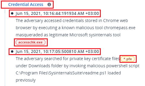 Liefert eine Beschreibung über die Aktivitäten und Absichten der Angreifers (im obigen Beispiel: Zugriff auf Anmeldedaten) und enthält zudem einen Link auf eine entsprechende MITRE ATT&CK-Technik. Klicken Sie auf den Link, wenn Sie mehr Informationen über die Technik auf der MITRE ATT&CK-Website erhalten wollen. Wenn für eine Angriffsphase keine MITRE ATT&CK-Technik bekannt ist, wird im Text des Headers kein Link angezeigt. Dies ist bei allgemeinen Techniken relevant, z. B. bei Dateien, die in einem zufälligen Ordner entdeckt werden.