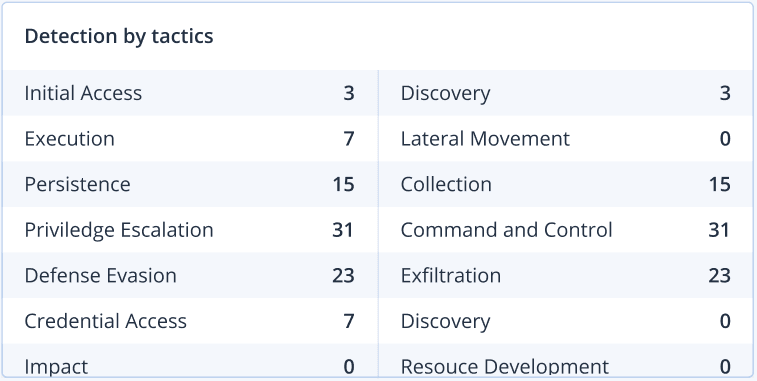 Im Widget Erkennung anhand von Taktiken werden die verschiedenen eingesetzten Angriffstechniken angezeigt. Wobei mit roten bzw. grünen Farben angezeigt wird, ob die Werte im Vergleich zum zuvor spezifizierten Zeitraum gestiegen oder gesunken sind. Dieses Widget zeigt eine aggregierte Ansicht aller Ziele für die gefilterten Vorfälle an. Dadurch können Sie sich schnell einen Überblick darüber verschaffen, welche Auswirkungen die Vorfälle auf Ihre Kunden haben.