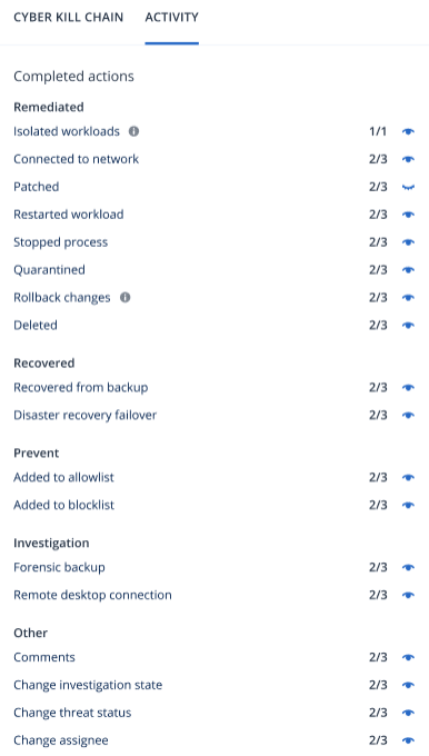 Zum besseren Verständnis der ergriffenen Maßnahmen können Sie sich alle Antwortaktionen anzeigen lassen, die auf einen gesamten Vorfall angewendet wurden. Alternativ können Sie sich diejenigen Aktionen anzeigen lassen, die nur auf einen bestimmten Knoten in der Cyber Kill Chain des Vorfalls angewendet wurden.