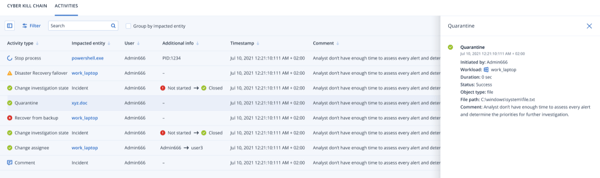 - Klicken Sie auf eine Zeile mit einem Aktivitätstyp, um sich weitere Informationen über die ausgewählte Aktivität anzeigen zu lassen. Die Informationen werden (wie in Schritt 3 gezeigt) in einer Seitenleiste angezeigt und enthalten Details darüber, wer die Aktion ausgelöst hat, wie deren Status lautet, auf welche Workload sie abzielt, den Dateipfad sowie etwaige Kommentare des Auslösers.
