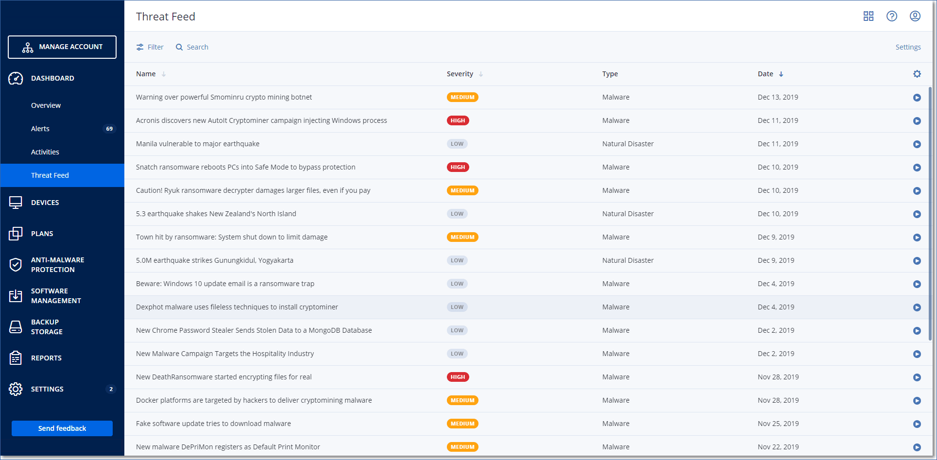 Das Acronis Cyber Protection Operations Center (CPOC) generiert Sicherheitsalarmmeldungen, die nur zu entsprechenden geographischen Regionen gesendet werden. Diese Sicherheitsmeldungen liefern Informationen über Malware, Schwachstellen, Naturkatastrophen, zu relevanten Aspekten der öffentlichen Gesundheit und anderen Arten von globalen Ereignissen, die Ihre Data Protection beeinträchtigen können. Der Bedrohungsfeed informiert Sie über potenzielle Bedrohungen und ermöglicht Ihnen so, diese abzuwenden.