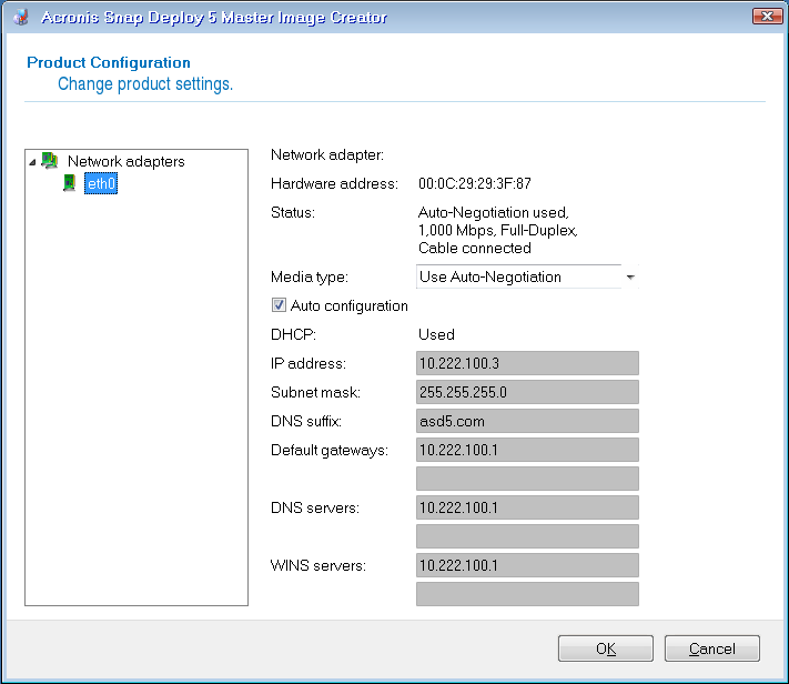 By default, Master Image Creator uses DHCP auto configuration. Ignore the prompt (click Cancel) if there is a DHCP server on the network or the image has to be placed on a local hard disk or a removable media.