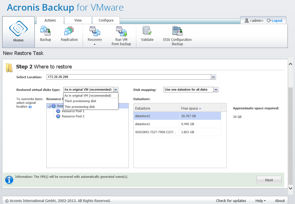 You should also define the format of the restored virtual drives, As in original VM (recommended), Thick provisioning disk or Thin provisioning disk with the respective drop-down list. Thin provisioning increases the VM storage utilization by enabling dynamic allocation and intelligent provisioning of the physical storage capacity.