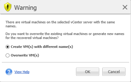 If there are virtual machines on the selected ESX(i) host or datastore with the same names, you will be asked to confirm overwriting the existing VMs. This choice defines the restored virtual machines naming. If you choose to “Overwrite VMs”, then the existing virtual machines will be replaced with the restored ones.