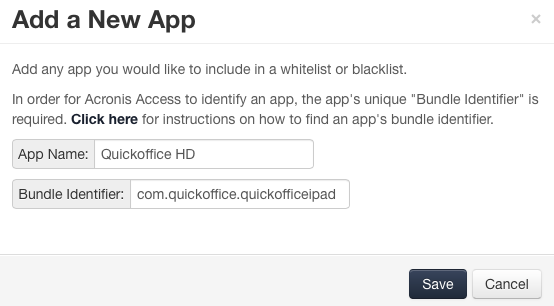 - Enter the app's Bundle identifier. This must match the intended apps bundle identifier exactly, or it will not white or blacklisted.