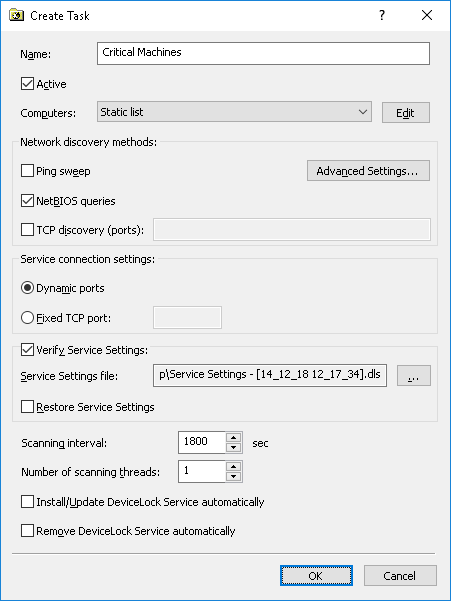 Note: If the DeviceLock Enterprise Server service is configured to run under the Local System account, you cannot install, update or remove DeviceLock Services on remote computers using a Monitoring task on DeviceLock Enterprise Server. |