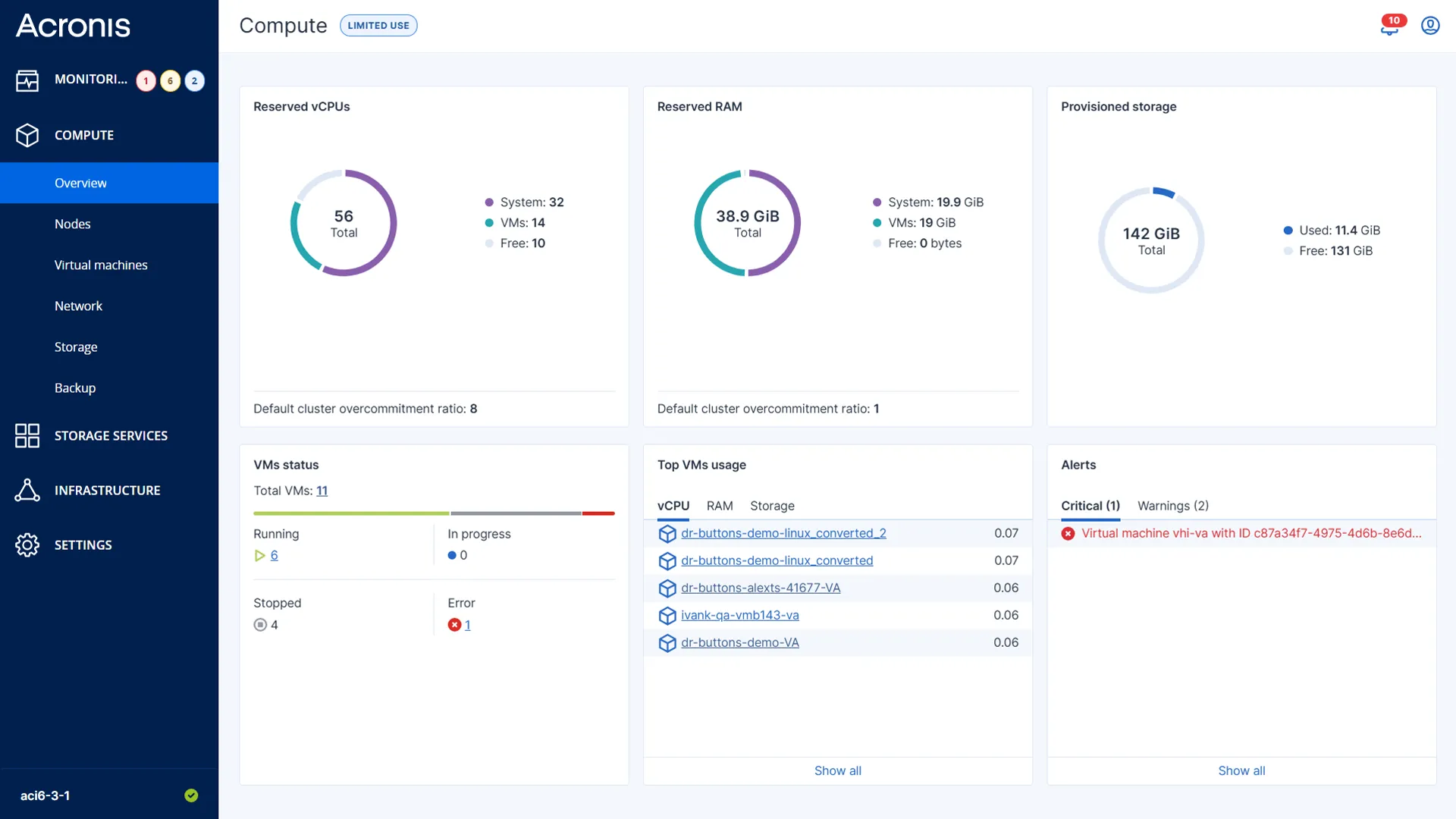 Acronis Cyber Frame is not just “another virtualization product.” It is a secure, AI-powered hyperconverged infrastructure (HCI) and infrastructure-as-a-service (IaaS) solution that enables SPs to deliver infrastructure services (VMs, block and object storage, networking) with integrated backup, DR, security and RMM. Built on OpenStack and natively integrated into Acronis platform, Cyber Frame supports multitenancy, white-label delivery and both SP-hosted and Acronis-hosted deployment options.