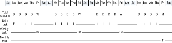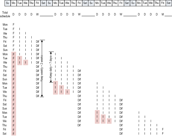 Here is how the first month of your backup plan will appear in real life. “F” stands for full backup. “Dif” stands for differential backup. “I” stands for incremental backup.