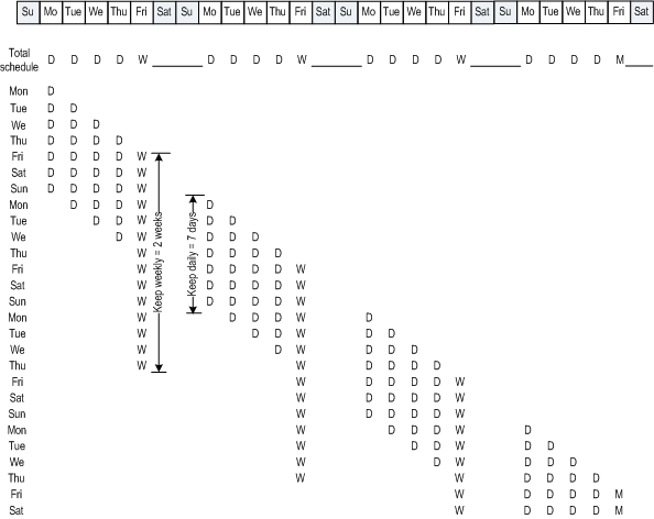 The left column shows days of the week. For each day of the week, the content of the archive after the regular backup and the subsequent cleanup is shown.