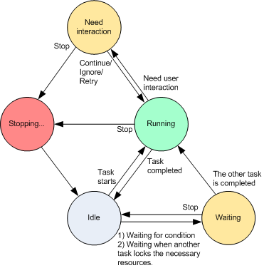 A task can be in one of the following states: Idle; Waiting; Running; Stopping; Need interaction. The initial task state is Idle.