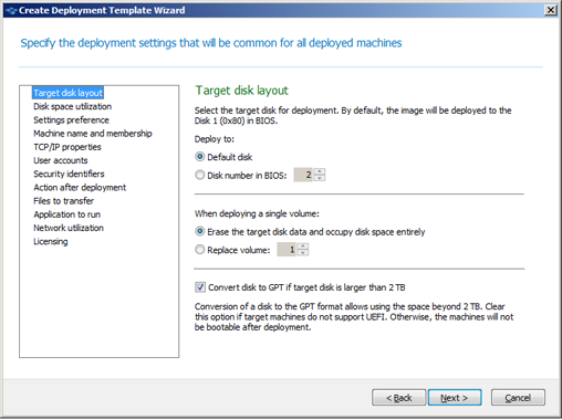 If you are deploying MBR disk or volume, specify if target disk should be converted to GPT when image is being deployed to machines with hard disk larger than 2TB.