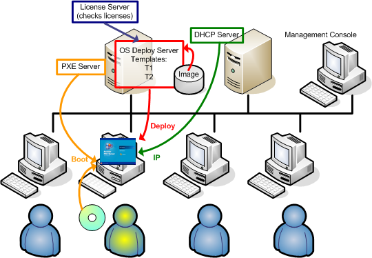 The administrator creates an Acronis bootable media with these templates or uploads these templates to a PXE server. The administrator then switches on the user-initiated deployment mode.