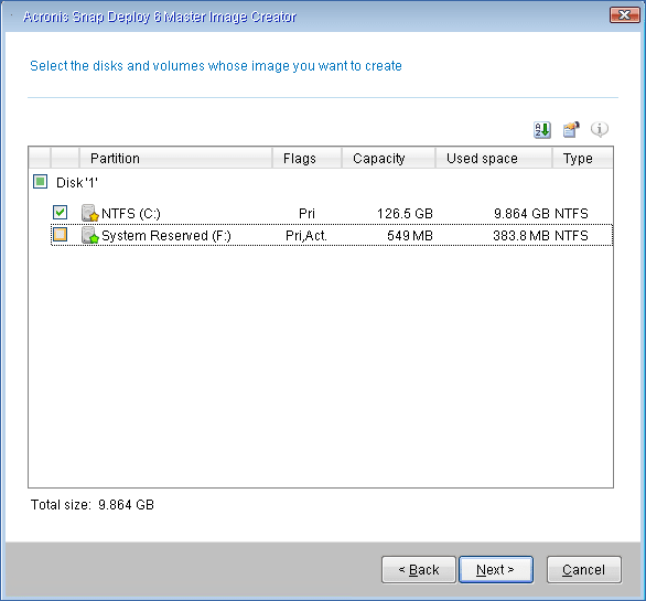 6. Select the volumes that you want to include in the master image. You can leave the default selection, which normally includes the volumes that contain the operating system.