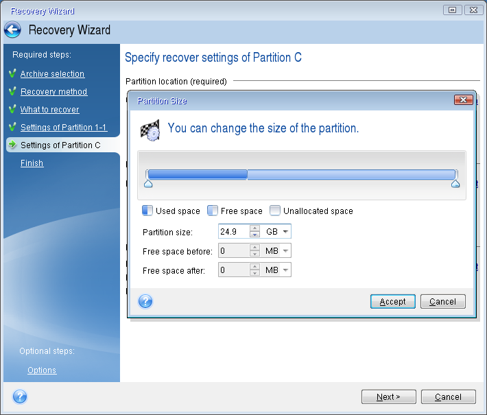 Size. Click Change default in the Partition size area. By default the partition occupies the entire new disk. Enter the correct size in the Partition size field (you can see this value on the What to recover step). Then drag this partition to the same location that you saw in the Backup Information window, if necessary. Click Accept.