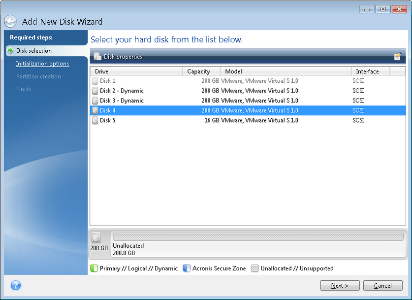 Select the disk that you have added to the computer. If you have added several disks, select one of them and click Next to continue. You can add the other disks later by restarting the Add New Disk Wizard.