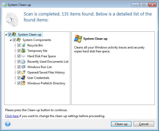 If you want to change the default system clean-up settings, click the corresponding link in the first window of the System Clean-up wizard.