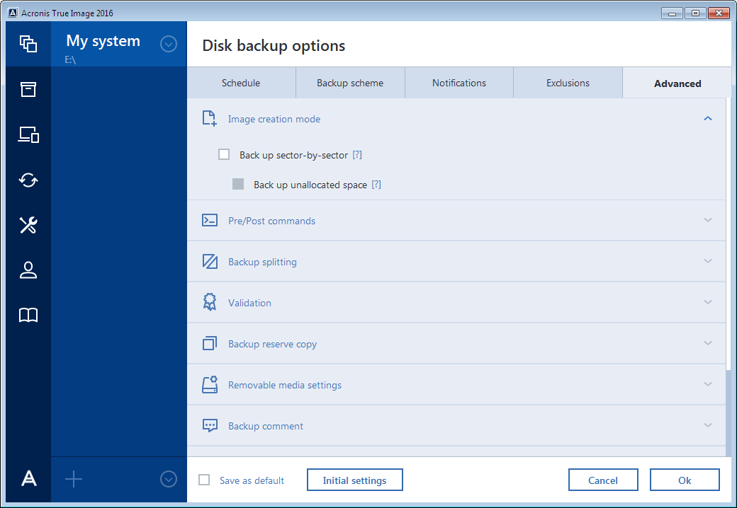 After you have installed the application, all options are set to the initial values. You can change them for your current backup operation only or for all backups that will be created in future. Select the Save the settings as default check box to apply the modified settings to all further backup operations by default.