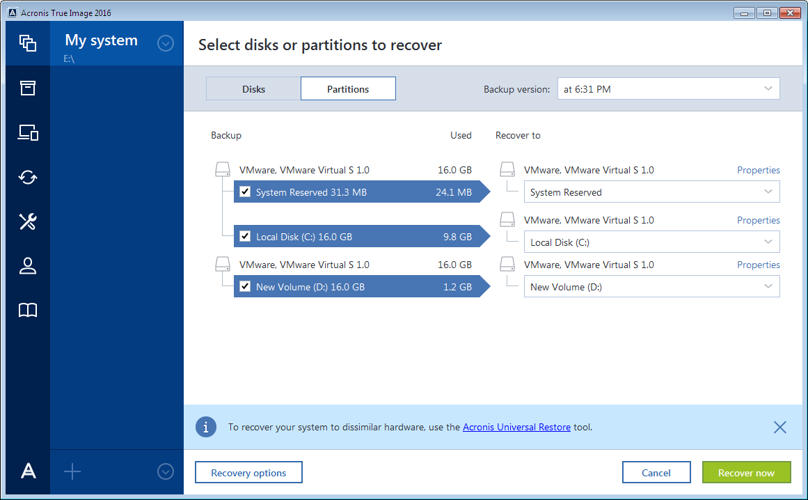 In the Backup section, select the backup which contains the partitions or disks you want to recover, and then click Recover disks.