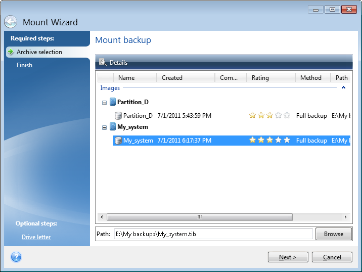 Select the backup for mounting by its creation date/time. Thus, you can explore the data state at a certain moment.