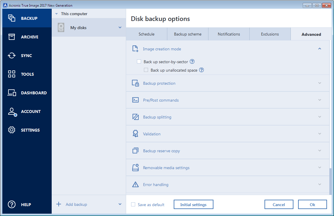After you have installed the application, all options are set to the initial values. You can change them for your current backup operation only or for all backups that will be created in future. Select the Save the settings as default check box to apply the modified settings to all further backup operations by default.