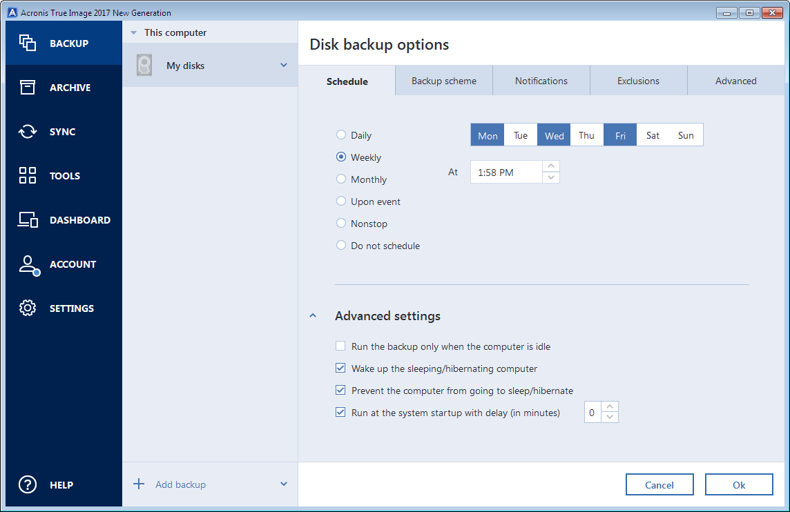 If the computer is switched off when the scheduled time comes, the operation won't be performed. You can force the missed operation to run at the next system startup. To do so, select the Run at the system startup with delay (in minutes) check box.