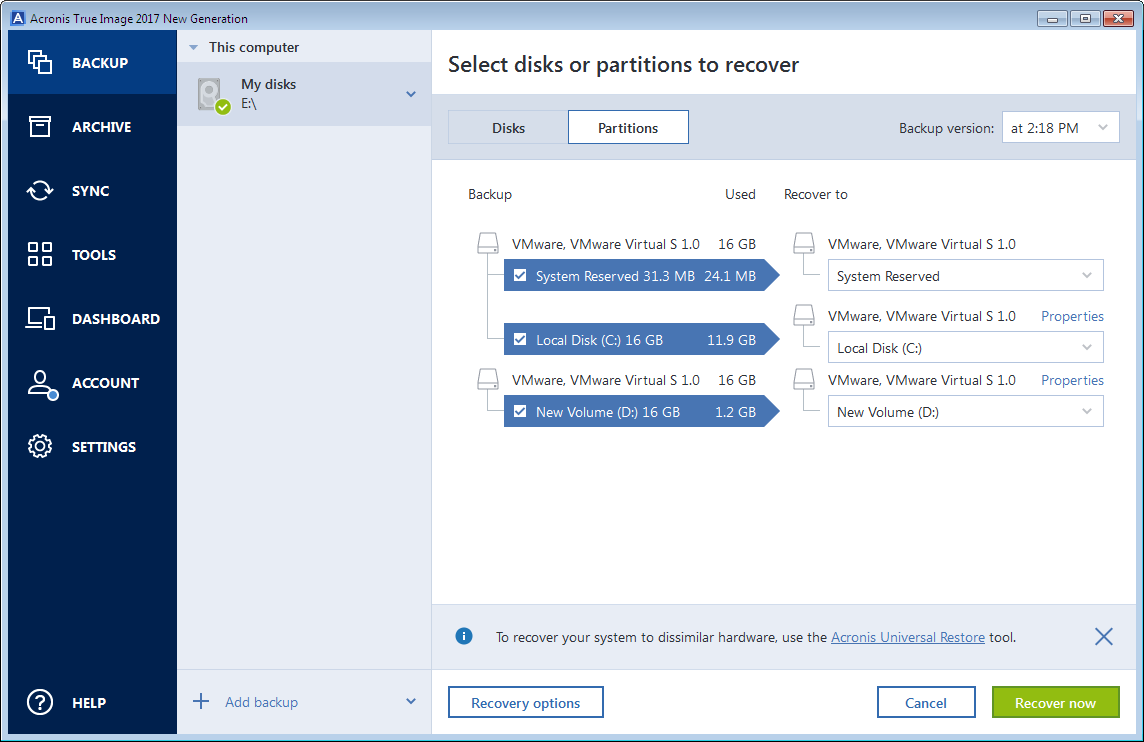 In the Backup section, select the backup which contains the partitions or disks you want to recover, and then click Recover disks.
