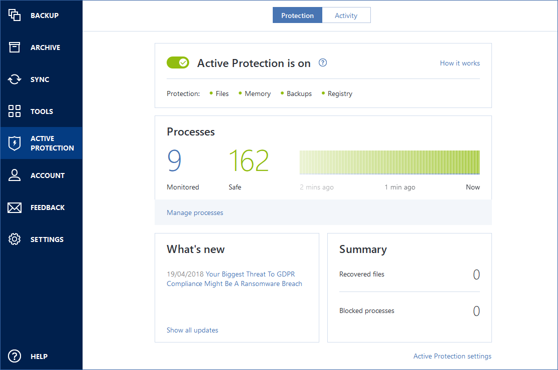 Acronis Active Protection dashboard
