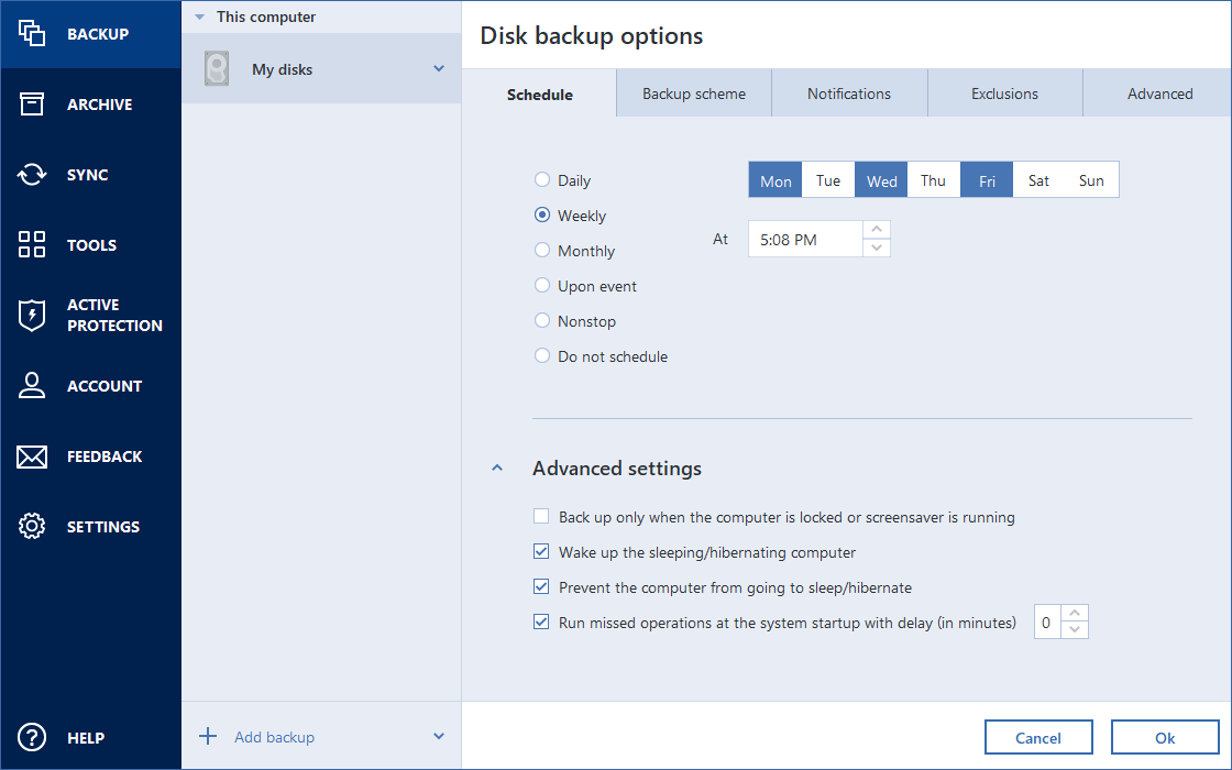 Do not schedule—The scheduler will be turned off for the current operation. In this case the backup or validation will run only when you click Back up now or Validate respectively in the main window.