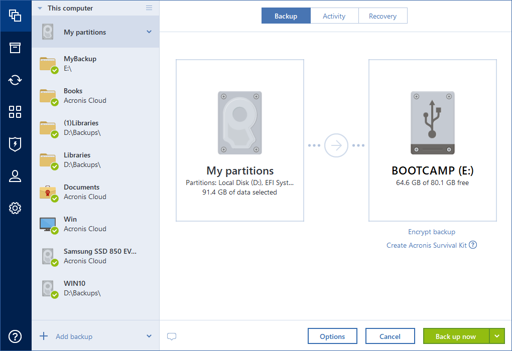 When you configure a backup of your system partition, entire computer, or any disk backup and select an external hard disk drive as a destination, Acronis True Image 2019 will suggest creating an Acronis Survival Kit.